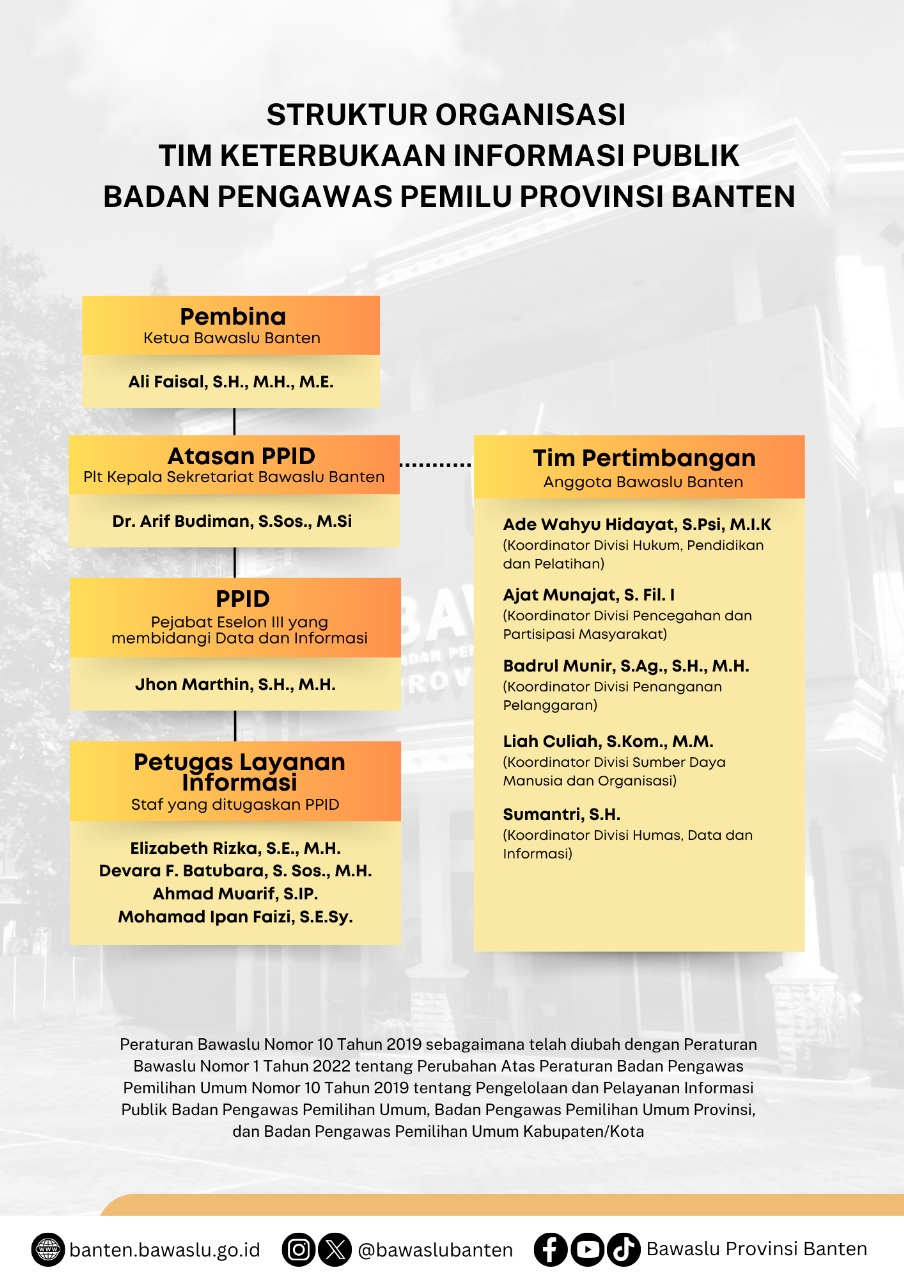 Melalui semangat keterbukaan informasi publik, Bawaslu Provinsi Banten membentuk Pejabat Pengelola Informasi dan Dokumentasi (PPID) Bawaslu Banten dengan surat keputusan Badan Pengawas Pemilu (BAWASLU) Provinsi Banten nomor : 023-KEP Tahun 2016 Tanggal 30 Mei 2016 tentang Pembentukan TIM Pelaksana Pejabat Pengelola Informasi dan Dokumentasi (PPID) Badan Pengawas Pemilu Provinsi Banten.